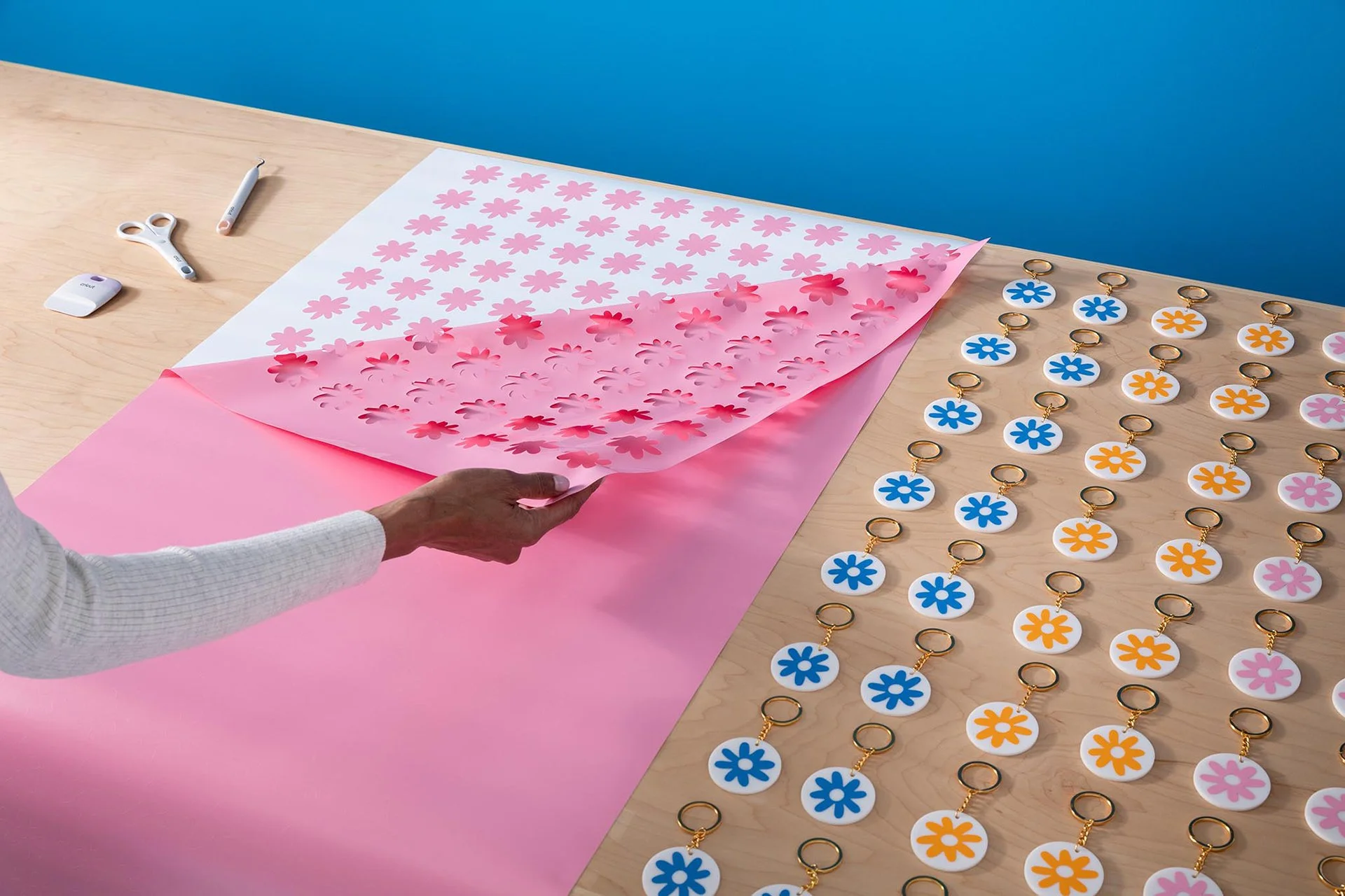A bold, high-contrast background ensures the machine remains the clear focal point (and improves accessibility, helping to make creativity accessible to all), while the peg-board background subtly evokes a professional maker’s workspace.